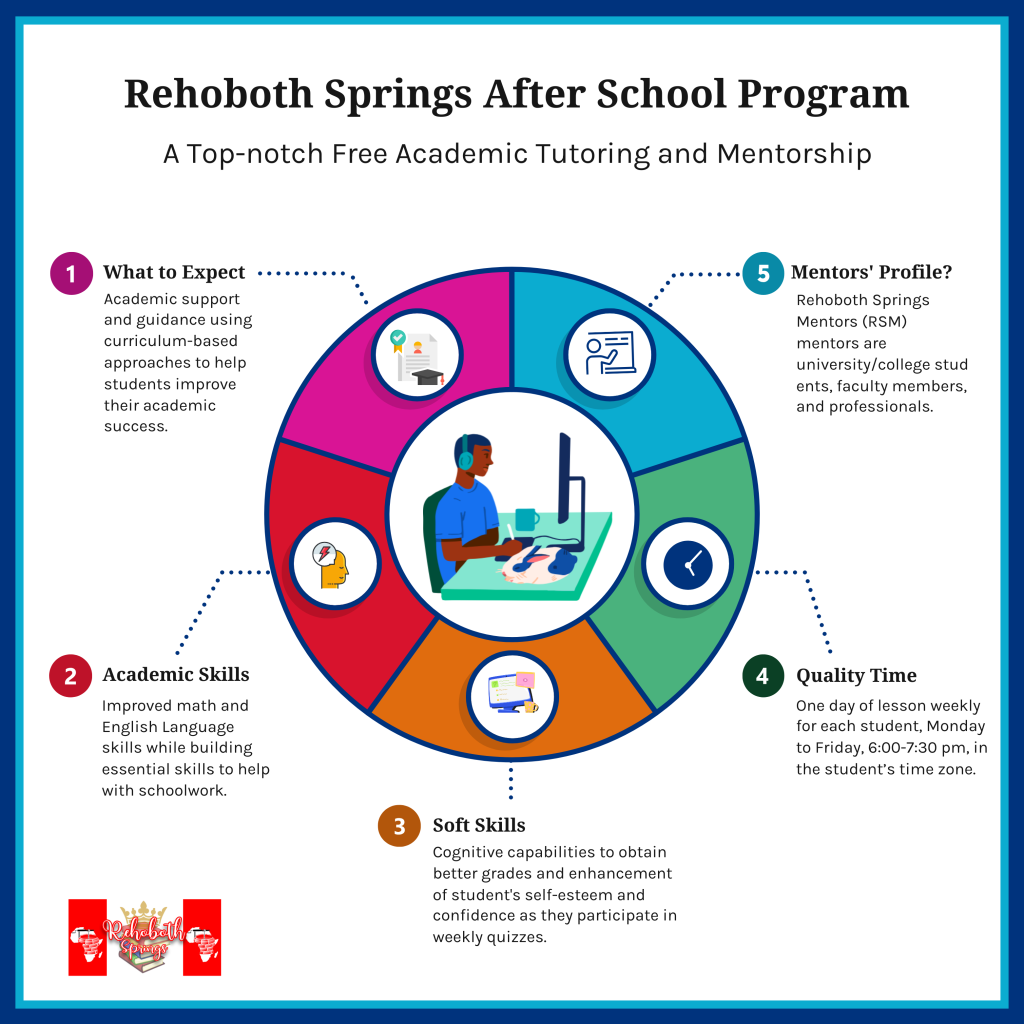 Rehoboth Springs’ After School Program (RSASP) is an innovative, interactive, engaging online platform where students in grades elementary, middle, and high schools to sharpen their math, English language, and science skills. RSASP focuses on helping students facing academic challenges to develop significant interests to increase their understanding of these subjects by matching them with mentors who provide them with solutions specific to their needs.